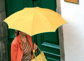 Chame despois a atención dos seus estudantes sobre o que leva a muller (un paraugas e un bolso). Aproveite para comentar se coñecen o tópico de que en Galicia chove moito e pregúntelles a continuación que obxectos ou complementos adoitan levar eles cando saen á rúa.
